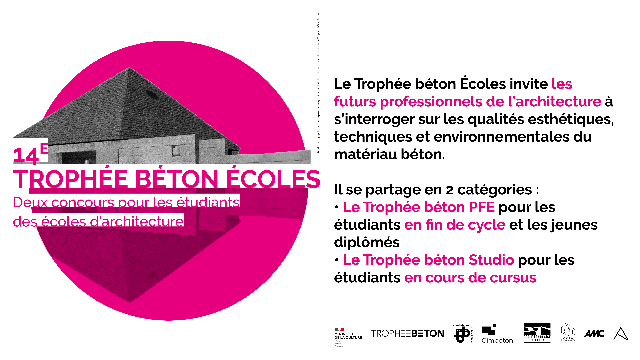 Inscriptions et remise des projets en ligne jusqu'au 31 octobre 2025 : https://trophee-beton.wiin.io/fr/applications/trophee-beton-ecoles-14eme-edition